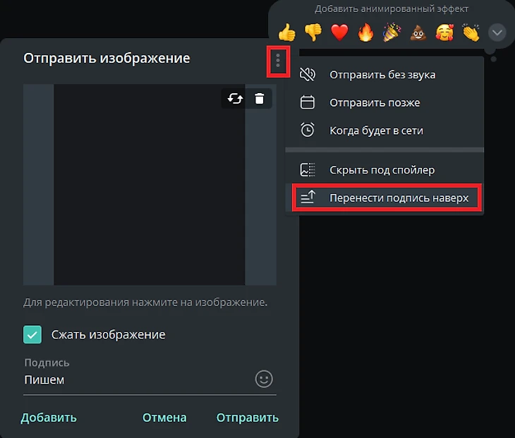 Текст над картинкой вместо надписи снизу: как в ТГ перенести подпись к фото наверх?