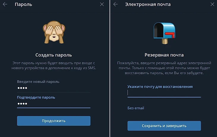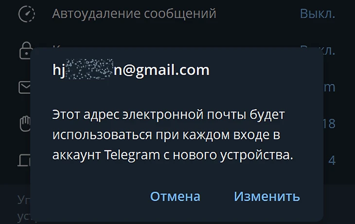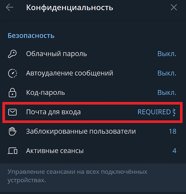 Если в настройках приложения отсутствует пункт «Почта для входа», подключите облачный пароль. Он дополнительно потребуется для доступа к учетной записи Telegram с нового устройства.