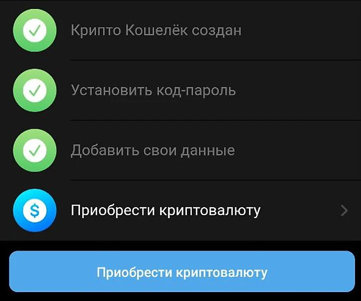 Ваш кошелек готов к работе. Чтобы пополнить его, нажмите «Приобрести криптовалюту».