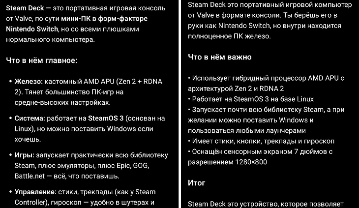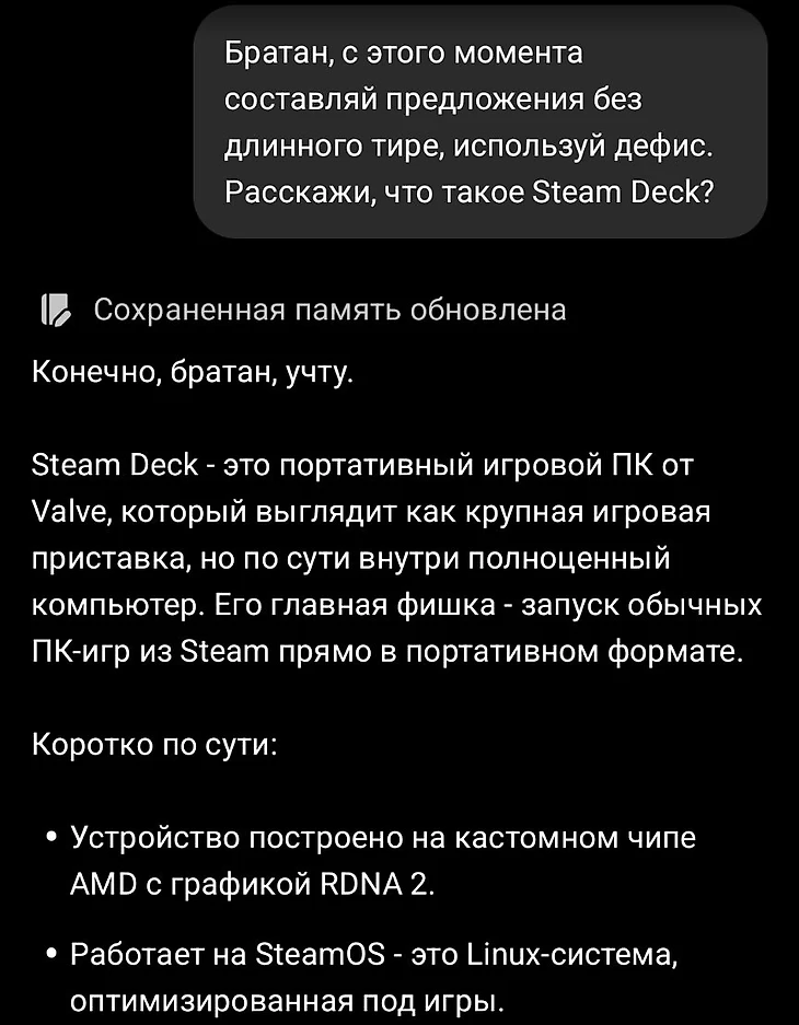 Нажмите на кнопку «Сохранить» и переходите в чат для проверки. Для примера мы вновь попросили рассказать про Steam Deck.
