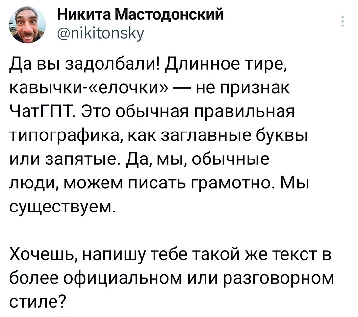Длинный тире придумала не нейросеть. Она обучается на громадном массиве информации (книги, журналы, статьи), написанным человеком по правилам и нормам грамматики. Проще говоря, чат-бот лишь имитирует принятые литературные нормы, потому длинные тире не являются надежным доказательством использования ИИ. И все же пользователей раздражало, что ChatGPT был не способен избегать этого символа даже при соответствующей просьбе.