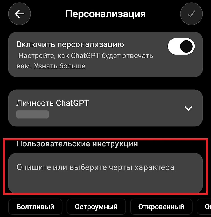 Настройка функции доступна всем пользователям как в мобильном приложении, так и с браузера. Для этого откройте ChatGPT, выберите свой профиль и перейдите в раздел настроек. Затем найдите пункт «Персонализация» и напишите пользовательские инструкции.