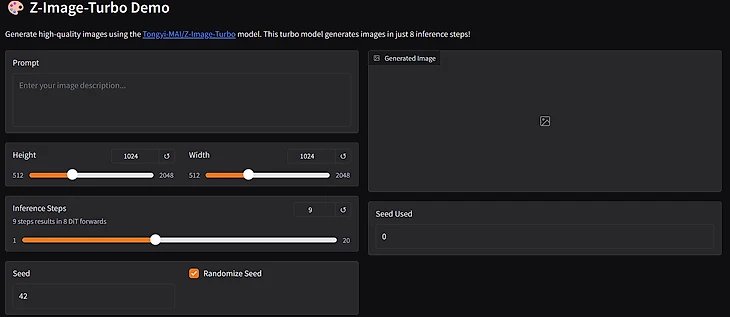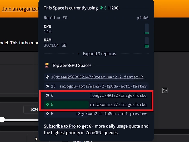 Интерфейс достаточно интуитивный, но может незначительно отличаться в зависимости от профиля демо. На выбор доступно несколько пространств – выбираем любой с припиской Z-Image Turbo. Находятся они во вкладке «Running on ZERO» в верхней части экрана.