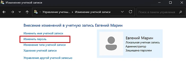 Не самый очевидный, но очень короткий путь к установке стандартного пароля на вход в Виндовс 11. Здесь мы используем встроенную функцию его замены, однако она подходит и для назначения – отсутствие пароля винда принимает за существующий, но «пустой».