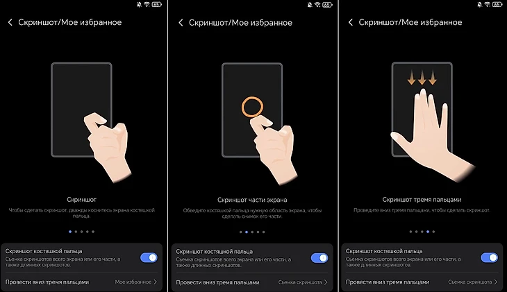 В новом окне можно ознакомиться с доступными способами создания скриншотов (костяшками пальцев, провести пальцами) и дополнительные настройки. Так, к примеру, двойное постукивание костяшками пальцев создает скриншот, обводка ими по области выделяет конкретную часть экрана для снимка, а проведя тремя пальцами вниз, сохраняется полный снимок.