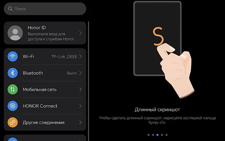 Длинный скриншот создает большой вертикальный кадр, который можно проскролить сверху вниз. Сделать его можно двумя способами: при создании обычного снимка экрана нажать на миниатюре на кнопку «длинный скриншот», либо проведите костяшкой пальцев по экрану в форме буквы «S». Последний, однако, не самый удобный метод – скриншот удается сделать только на той области экрана, где нет движущихся элементов.