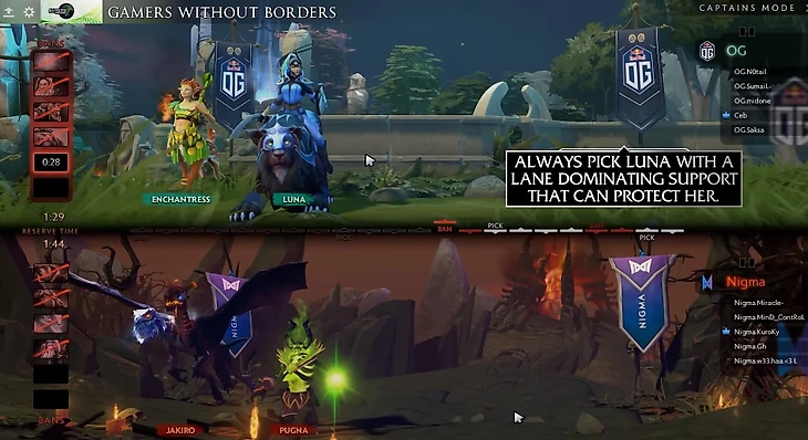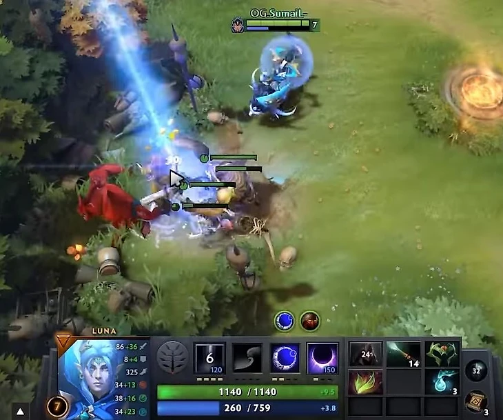 Под Луну требуется хорошая линия. Нужен саппорт, который сможет защитить этого героя на линии. Если посмотреть на драфт OG – они почти всегда берут Энчу под Луну. Все из-за того, что ранний лейнинг Луны очень плох, а Энча, наоборот, доминирует на этой стадии игры. Более того, пассивка Луны отлично сочетается с Энчой.