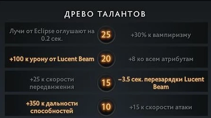 Далее Сумаил максит Lucent Beam. Билд через Lunar Blessing и Lucent Beam куда более сбалансированный, чем через Moon Glaives, ведь не смещает фокус героя полностью в сторону фарма. Его полный скиллбилд выглядит так.