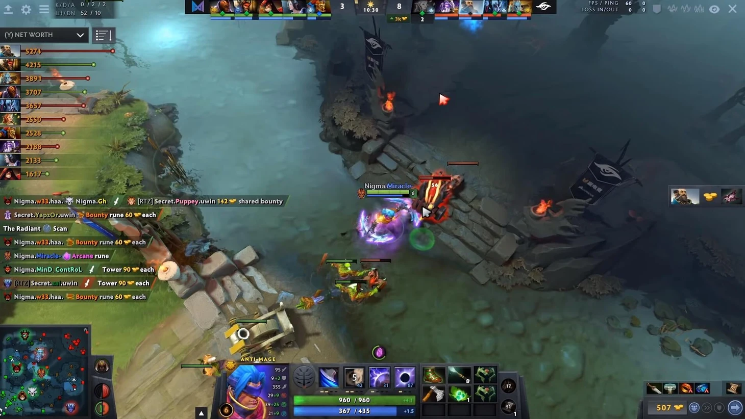 В этой игре Миракл свободно может пушить линию под башню, ведь у Сикрет почти не способностей, анимацию которых он не сможет увидеть заранее. Единственная проблема – Крест Кункки, но Ниша сейчас показывается на карте, поэтому на его телепорт Амер без проблем среагирует и покинет линию.