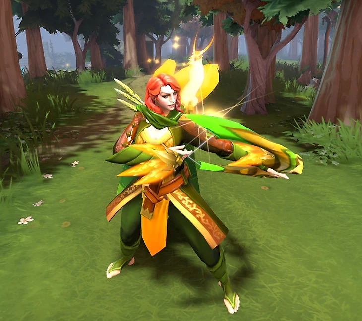 И снова невероятно редкий предмет, но уже из 2019 года и куда более доступный. У героя тоже есть множество вариантов в слот оружия и все эти варианты почти одинаковые. Но не этот лук, ведь он вносит оттенки теплого красного в холодный образ Дровки.