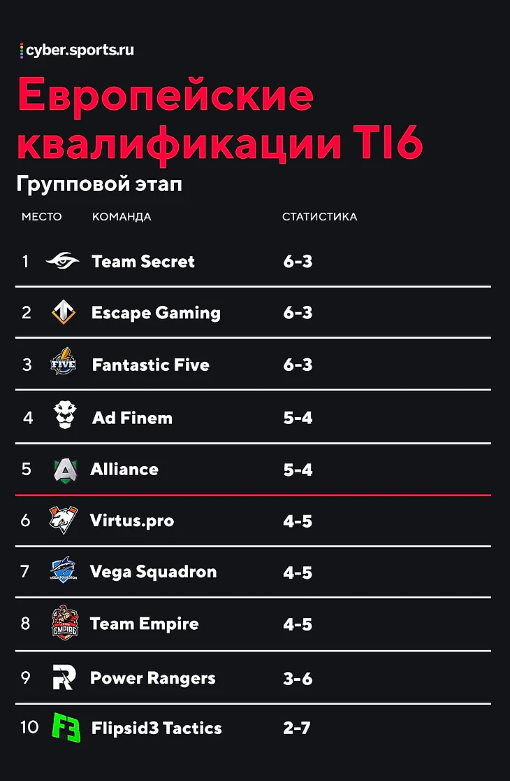 И как на квалах. Отлично стартовали: закончили первый день со счетом 4-1, победили прямых соперников (Empire и Power Rangers) и Secret. Второй день – 4 игры и 4 поражения, в том числе и от Flipsid3 Tactics.