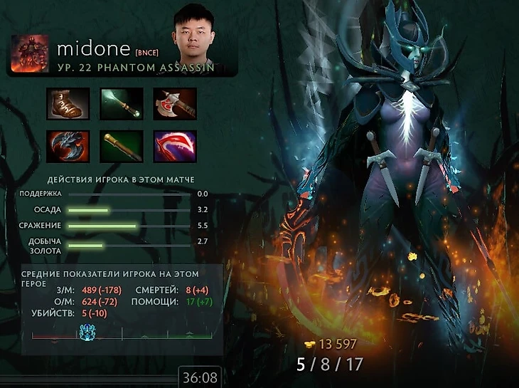 Он передумал собирать БКБ после Дезоля и взял Сатаник, оставив Ogre Axe. Из-за этого он вечно стоял в контроле, а доля полученного им физического урона – всего 17% (меньше всех в команде, даже в абсолютном значении), а магического – около 40%.