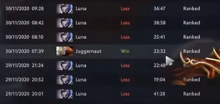 Помните те времена, когда Луне регулярно собирали Доминатор, а герой не был булкой для всех метовых оффлейнеров? На самом деле, это было не так и давно – до 7.27 герой явно был лучше, а сейчас ILTW, чуть ли не единственный, кто играет на Луне в хай-ММР пабах, и проигрывает на ней 7 матчей подряд (еще один луз выше):