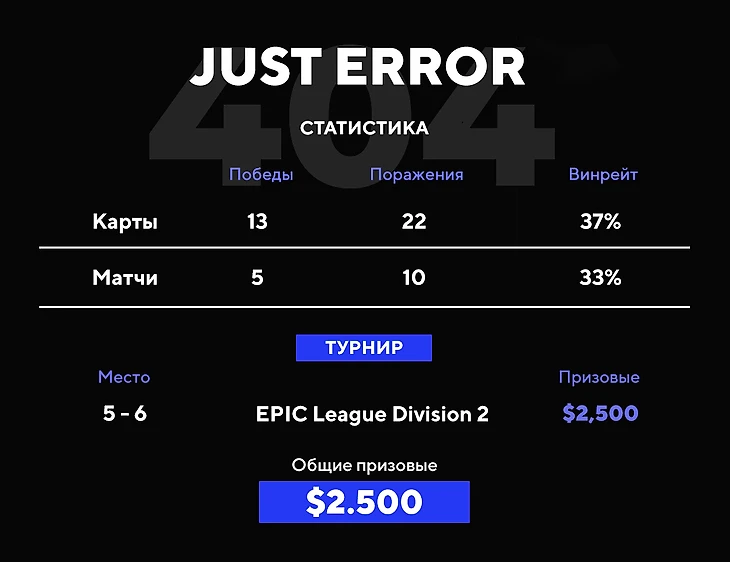 Just Error, потенциальная команда мечты с игроками «золотых» VP, распалась после провала на Эпик Лиге (топ-6 второго дивизиона). Со слов Рамзеса, у команды было множество проблем – языковой барьер, пинг, разные часовые пояса и плохая подготовка. Я же подробно остановлюсь на последней и отвечу на вопрос «Почему 404 не взлетели?».