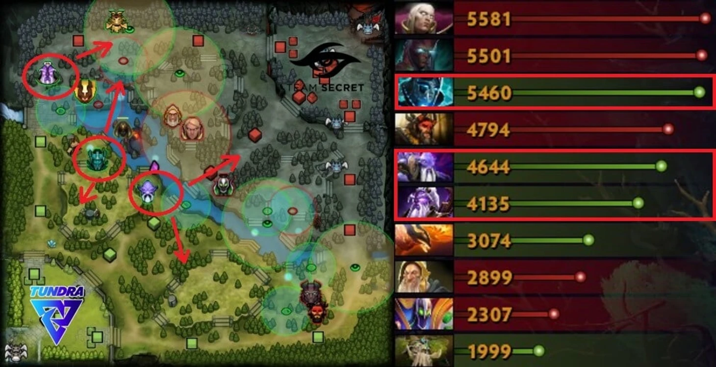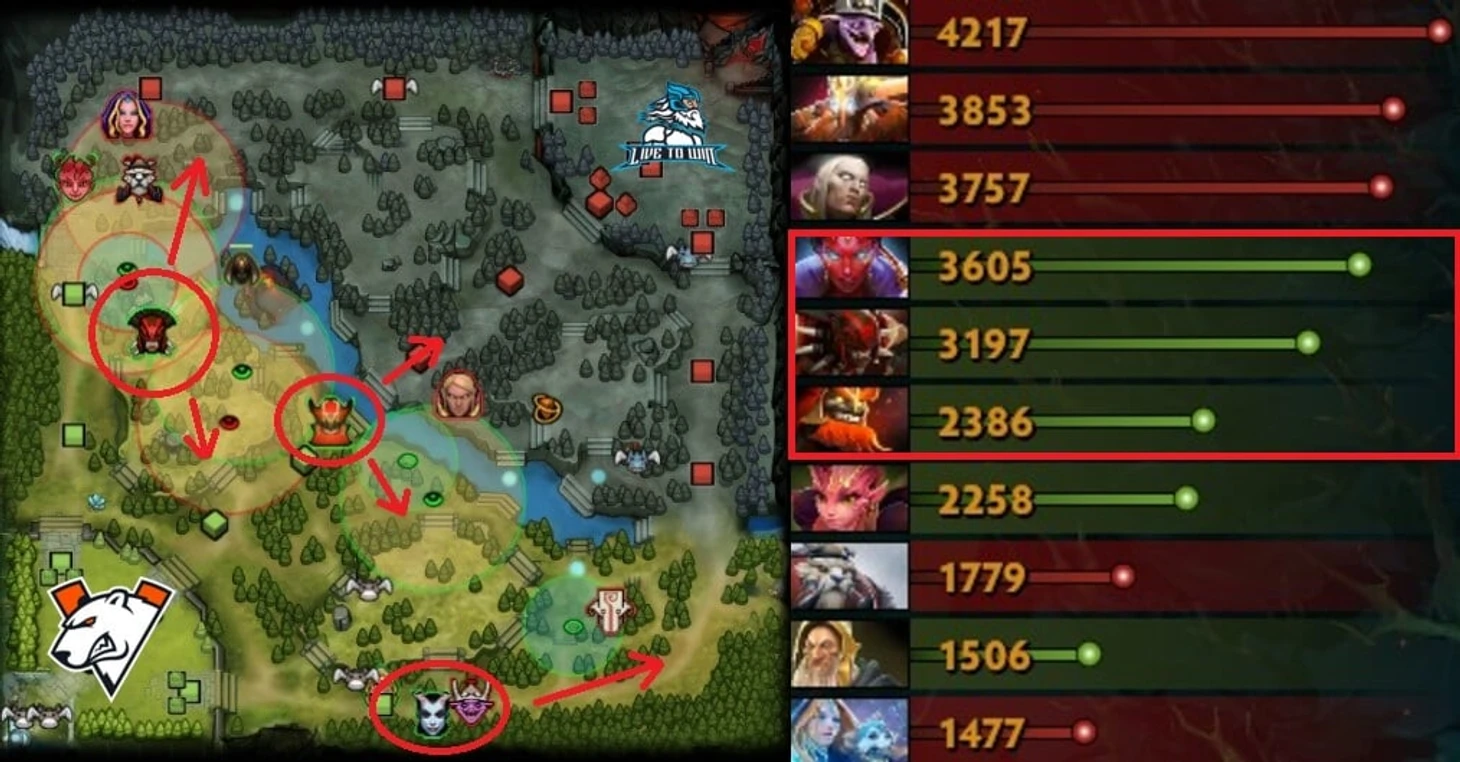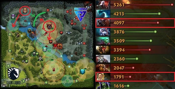 Задача команды при такой глобальной позиционке – стянуть все внимание противника на четверку боевых героев. Они постоянно атакуют территорию противника через выходы на башни или через смок-атаки в чужие области фарма. Идеальная ситуация – все драки активной четверки героев проходят на половине противника.