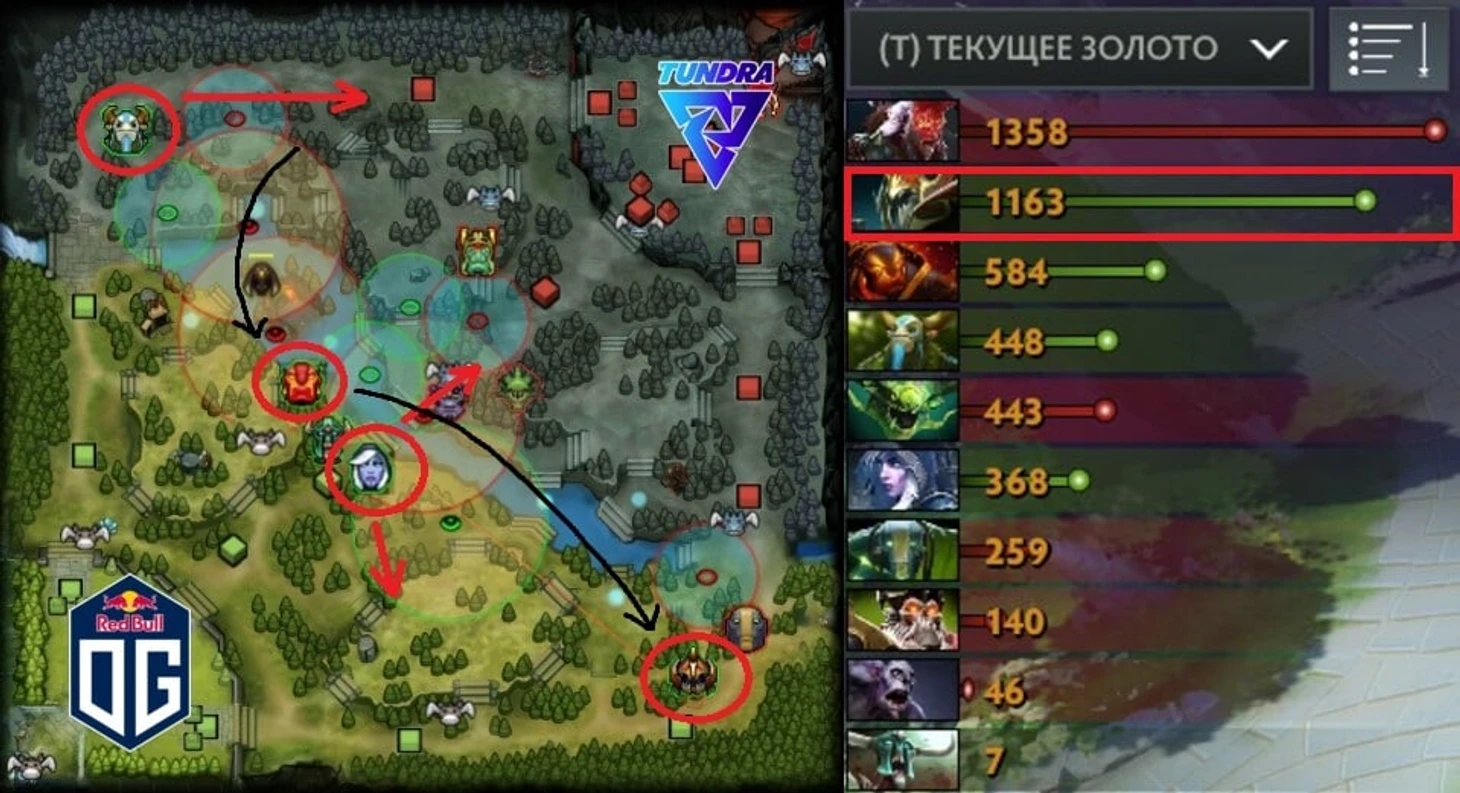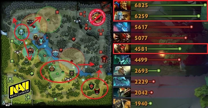 На период фарма важного предмета оффлейнер становится pos 2 или даже pos 1 (редко), получая безопасную линию и много пространства на карте. И это пространство ему обеспечивают саппорты или даже один из кор-героев. На этом примере 33 на Дарк Сире получил не только мид, но и большой лес с маленьким лагерем в треуголке, который он свободно забирает у Фантомки ради быстрого Аганима: