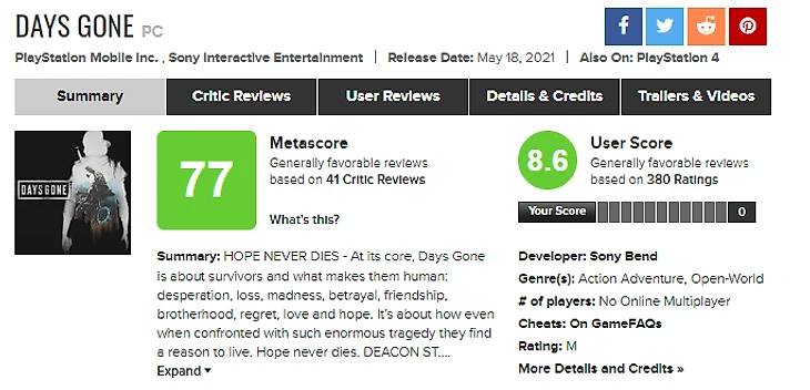 Продажи продажами, но также немаловажно мнение аудитории о проектах. И тут опять успех: Days Gone на пк имеет 92% положительных отзывов в стиме и оценку в 8.6 балла из 10 на Metacritiс от игроков. Как по мне, феноменальный показатель, который показывает заинтересованность аудитории в консольных играх. Подобную тенденцию можно увидеть на примерах Journey, Detroit Become Human. Да, не все было гладко, у Horizon Zero Dawn были проблемы с производительностью на старте, но сейчас guerrilla games решили проблемы и игра также получила 92% недавних положительных отзывов.