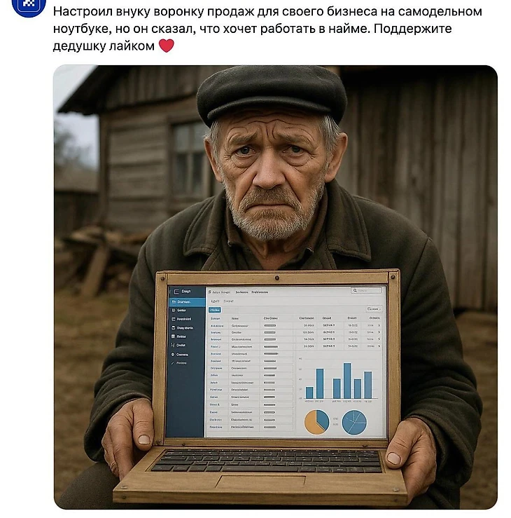 Российские бренды быстро смекнули, что делать: Ситилинк и Модульбанк запостили свои версии – в них несчастный дедушка сделал для внука хлебную видеокарту и воронку продаж на самодельном ноутбуке.