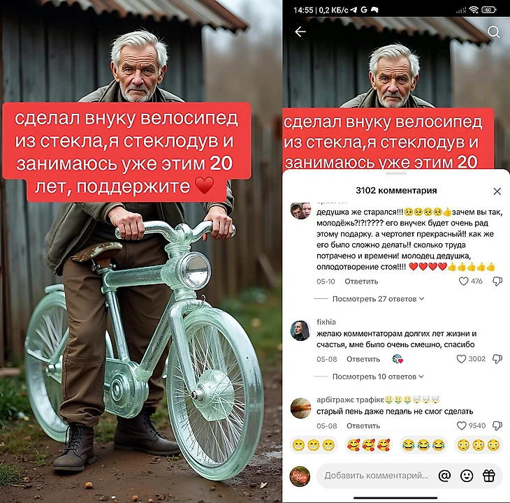 Автор добавил типичные фразочки сммщиков для выпрашивания лайков, кучу бумерских смайлов, и готово – дед сделал для внука тренд из нейрослопа, а внук сказал, что он старый болван. У него на аккаунте полно подобных роликов. И все они под неизменную мелодию «Встреча двух сердец» Павла Ружицкого.
