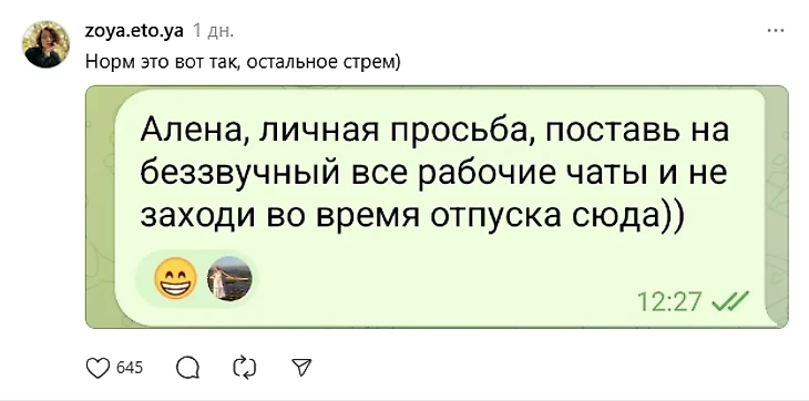 💬 «У меня на работе будет считаться грубым нарушением, если зайду даже в чат во время отпуска. 1. Система даже не пустит войти. 2. Менеджеру придет уведомление. 3. За три недели беспрерывного отпуска еще и доплачивают. Считаю, идеально»