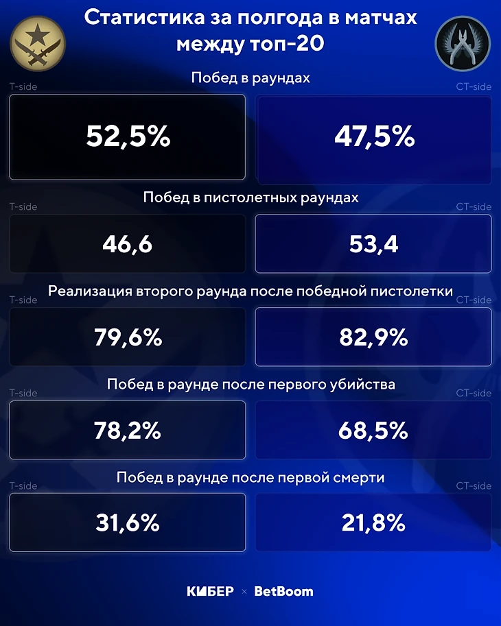 Из-за размеров Dust 2 небольшое преимущество имеет атакующая сторона. Интересно, что в матчах команд из топ-20 процент побед за Т выше, чем в среднем: 52,5% против 51,9%. Сильнейшие коллективы лучше реализуют пространство.