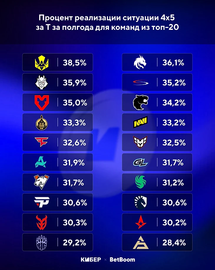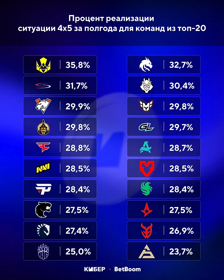 За атаку пережить смерть тиммейта намного легче: по-прежнему можно толпой навалиться на один из плентов и захватить его. Это подтверждают цифры: только две команды из топ-20 забирают меньше 30% раундов при 4х5.