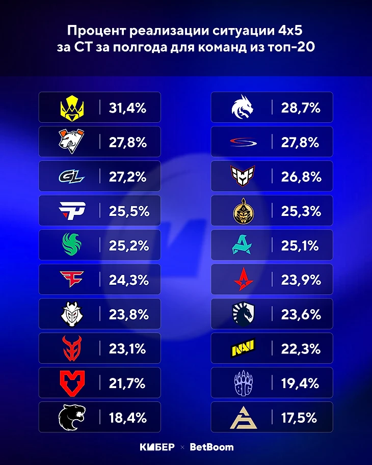 ➢ В топ-10 по игре 4х5 за CT только пять команд из топ-10 рейтинга HLTV.