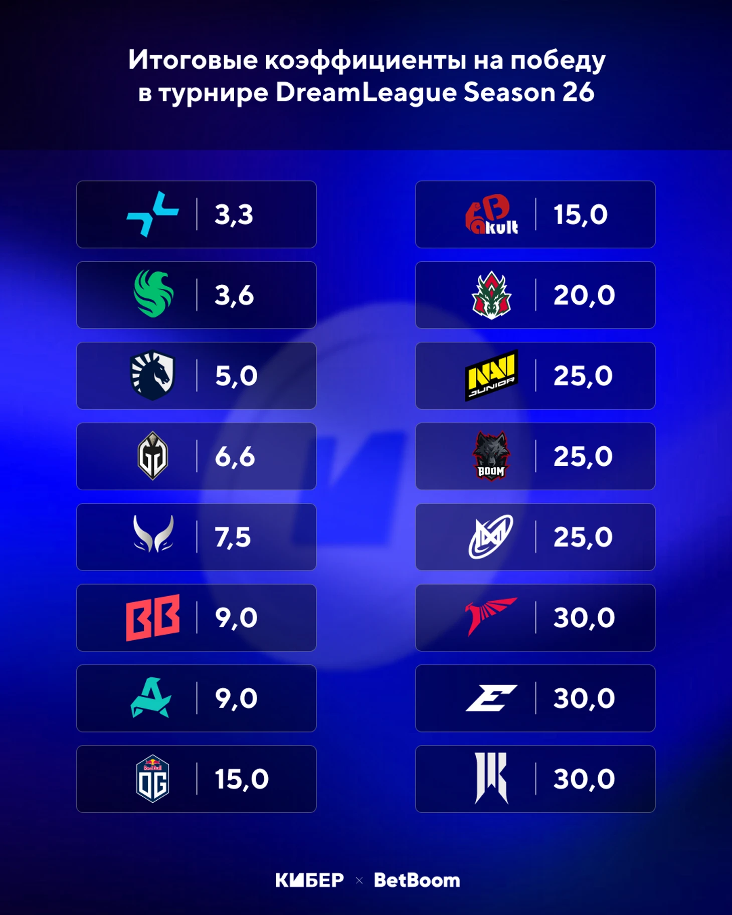 Попробуем предсказать итоговые места составов. В этом нам помогут коэффициенты от BetBoom.