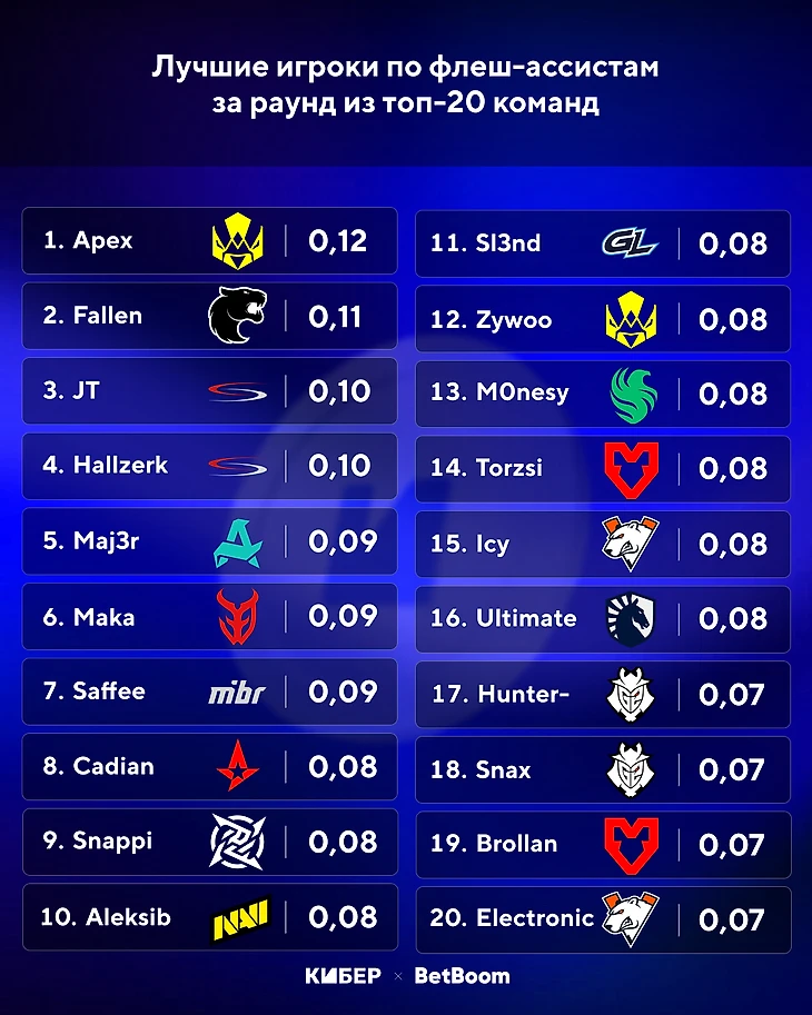 ➢Только четыре человека пробили показатель в 0,1 флеш-ассист. Остальные делают меньше 1 ассиста за 10 раундов.