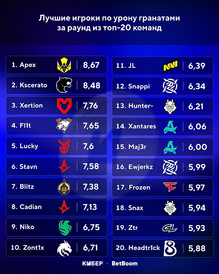 ➢B8 показала запредельную статистику по убийствам гранатами, но только Headtr1ck попал в топ-20 по урону. Faze, напротив, была на дне по этому показателю, но по урону Frozen выше Хедтрика.