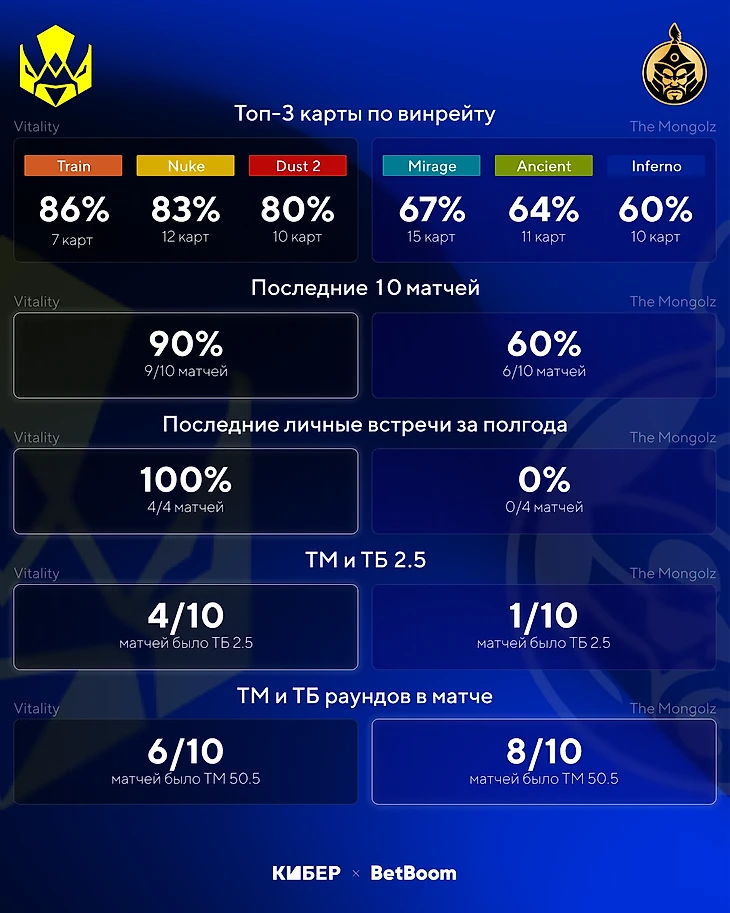 BetBoom не сомневается в победе Vitality: аналитики дают коэффициент 1,28 на победу французов. А вот пользователи BetBoom не так уверены: 44% из них поставили на победу The Mongolz. Возможно, часть из них хочет поддержать аутсайдера, а кому-то надоела доминация Vitality, но мы согласимся с аналитиками: предлагаем поставить на фору Vitality по картам (-1,5) с коэффициентом 2,05.