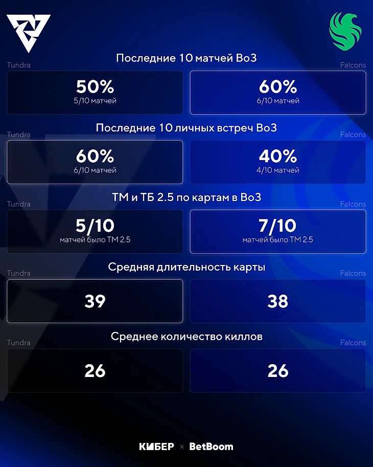 Tundra хорошо начинает игры: на 9 из 14 карт она сделала First Blood. У Falcons только 3 FB на 12 картах. BetBoom дает 1,85 на FB каждой из команд на первой карте. Tundra намного лучше в этом компоненте, поэтому отдам предпочтение ей.
