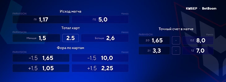 Heroic – одна из самых непредсказуемых команд. Это можно заметить по двум играм против PARIVISION на EWC: карты на 30-35 минут сочетались с часовыми. При этом в одном затяжном матче было всего 48 фрагов, а в другом – 90. Сложно что-то прогнозировать, но в этих матчах PVISION сделала FB на четырех из пяти карт. На продолжение тренда можно поставить с коэффициентом 1,68.