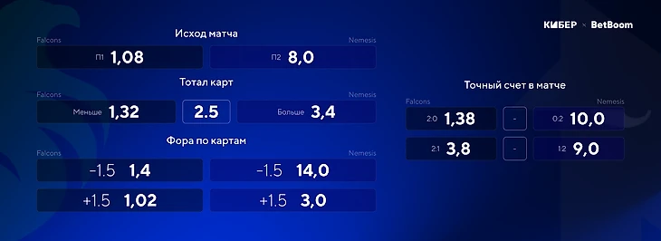 Сложно опираться на статистику Nemesis, ведь команда дебютирует на тир-1 чемпионате. Стоит вдвойне осторожнее подходить к ее цифрам, так как состав не играл официальных матчей с июня. Тем не менее можно отметить, что у пятерки часто получается сделать FB. В матче с Falcons, которые идут последними по этому показателю, такая ставка кажется логичной. На FB от Nemesis можно поставить с коэффициентом 2,1.