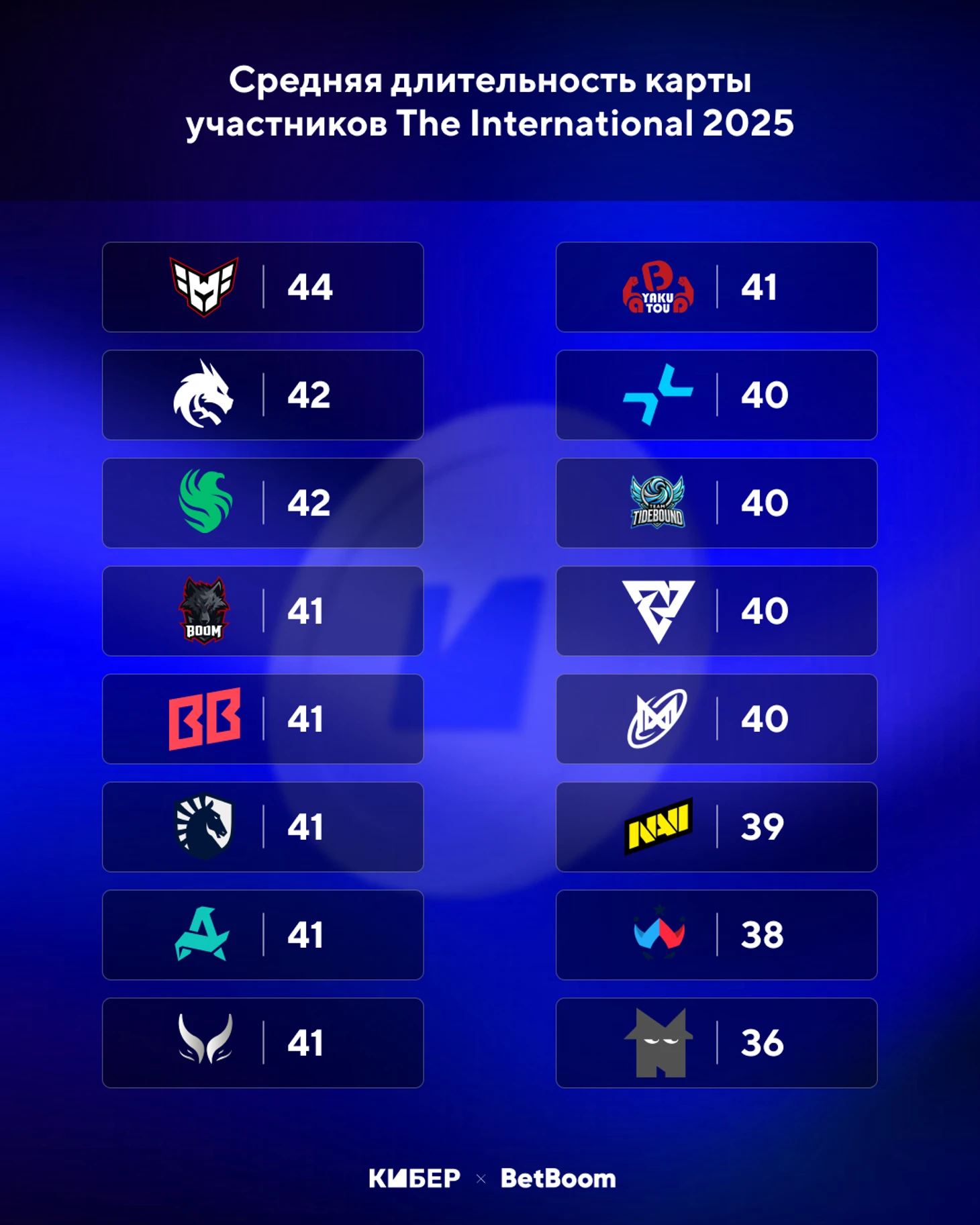 Другая возможная ставка – на длительность карты. Команды в среднем играют по 41 минуте, так что если получится поймать ТБ (38) или ТБ (39) с хорошим коэффициентом, то этим стоит воспользоваться.