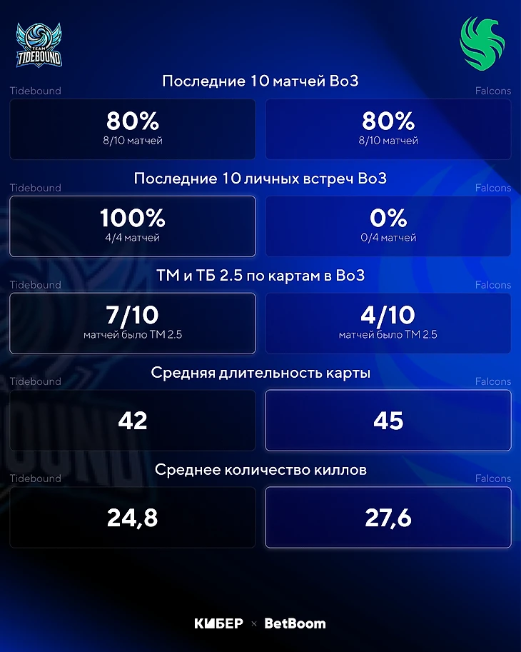 Из длительности игры следует и вторая ставка: матчи Falcons часто пробивают тотал по киллам. Лишь на 3 из 13 карт было сделано меньше 45 киллов, но и тогда команды подбирались близко с 42-43 фрагами. На тотал убийств больше 44,5 BetBoom предлагает коэффициент 1,72.