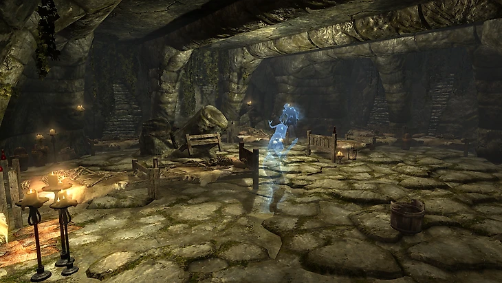Дальше, в локации «Глубины» можно увидеть одно из самых завораживающих мест Скайрима и израненного Кюра. Нам нужно изгнать Бледную леди, что бы это ни значило.