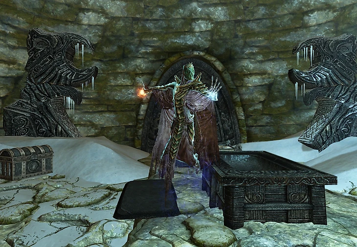 В руинах нас ждут призраки драконопоклонников и драугры, а их трупы лежат в собственных кроватях – действительно жуткое зрелище. Когда мы найдем дневник Скорма, станет понятно, какой способ отправиться в Обливион выбрали культисты – они отравили колодец. За тысячу лет яд точно выветрился – по крайней мере, так надеется Довакин, залезая в колодец. Там действительно больше нет яда. Чуть дальше будет трапезная и комната алхимика – кстати, если внимательно читать записки, то можно понять, что не все разделяют план безумного драконьего жреца Рагота. Алхимичка Фрода убеждает одуматься и не заставлять культистов убивать собственных детей перед ритуалом, но ее слова ничего не значат для сумасшедшего. Тело Фроды лежит на троне с мечом в груди.