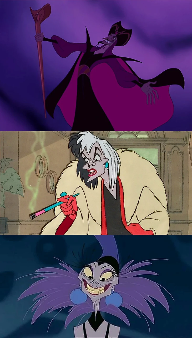 Примеры других злодеев из мультиков. Обратите внимание на острые формы – носы, подбородки, волосы.