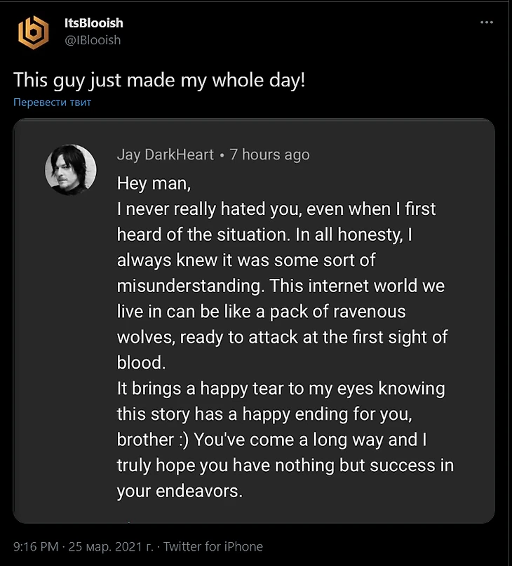 Автор письма: «Привет, парень. Я никогда не ненавидел тебя, даже когда впервые услышал о ситуации. Честно, я всегда знал, что это было что-то вроде недопонимания. В мире интернета на тебя может накинуться стая изголодавшихся волков, готовых к атаке. Я прослезился от счастья, когда узнал, чем вся история закончилась для тебя, брат. Ты прошел долгий путь, и я желаю тебе только успеха в твоих стремлениях».
