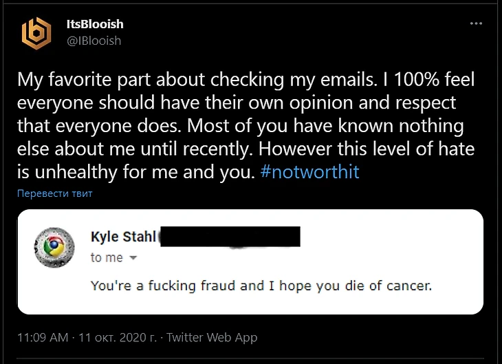 ItsBlooist: «Моя любимая часть проверки почты. Я на 100% считаю, что у каждого должно быть свое мнение, и уважаю это. Большинство из вас до недавнего времени ничего не знали обо мне. Такой уровень ненависти нездоров и для меня, и для вас #нестоиттого».