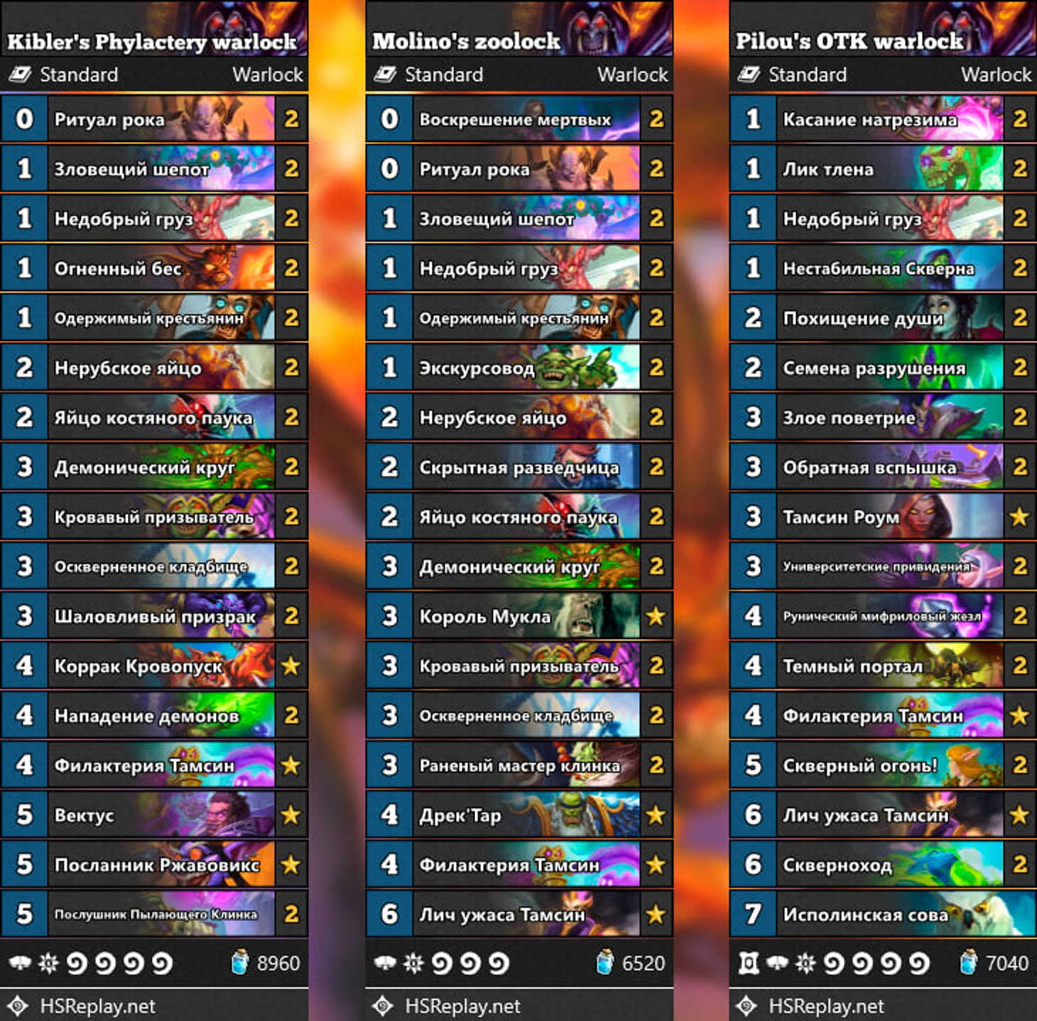 Чернокнижник получил «Филактерию Тамсин» – заклинание, которое раскапывает ваше существо с предсмертным хрипом, погибшее в матче, и наделяет всех ваших существ на столе его хрипом. Поэтому новые варианты колод Чернокнижника используют массовый призыв маленьких демонов на стол, чтобы потом дать им хрип «Исполинской совы» (наносит 8 урона сопернику), Ржавовикса или еще кого-нибудь полезного.