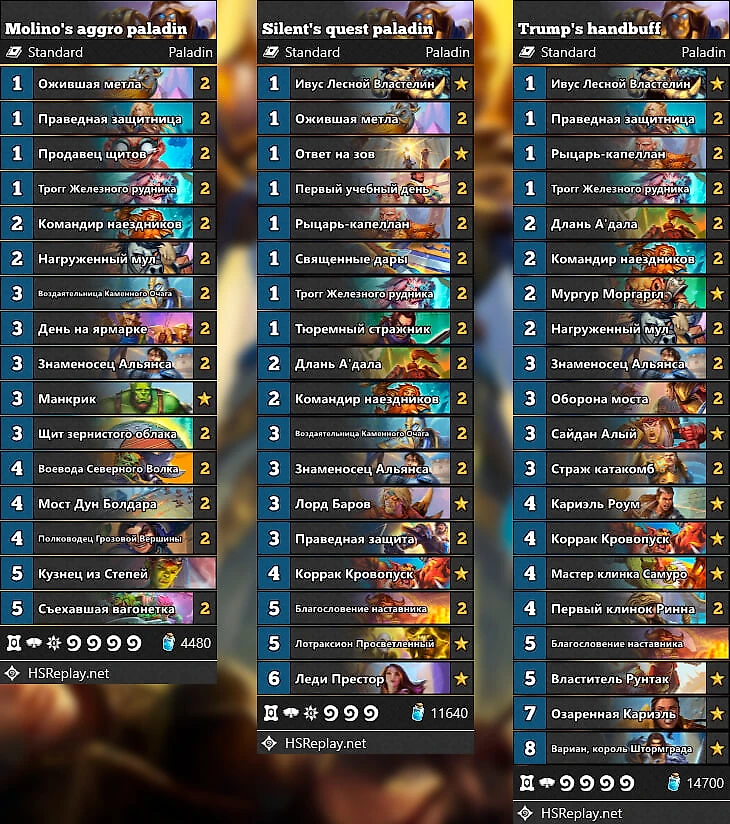 Пока у Паладина есть пак секретов и манускриптов, придумывать что-то оригинальное нет смысла – пусть новыми картами играют те, у кого старые плохие. Однако стримеры придумали, как использовать заклинание «Мост Дун Болдара» (оно баффает призванных существ на +2/+2 и длится 3 хода) – просто спамить на стол паладинчиками или другими мелкими существами.