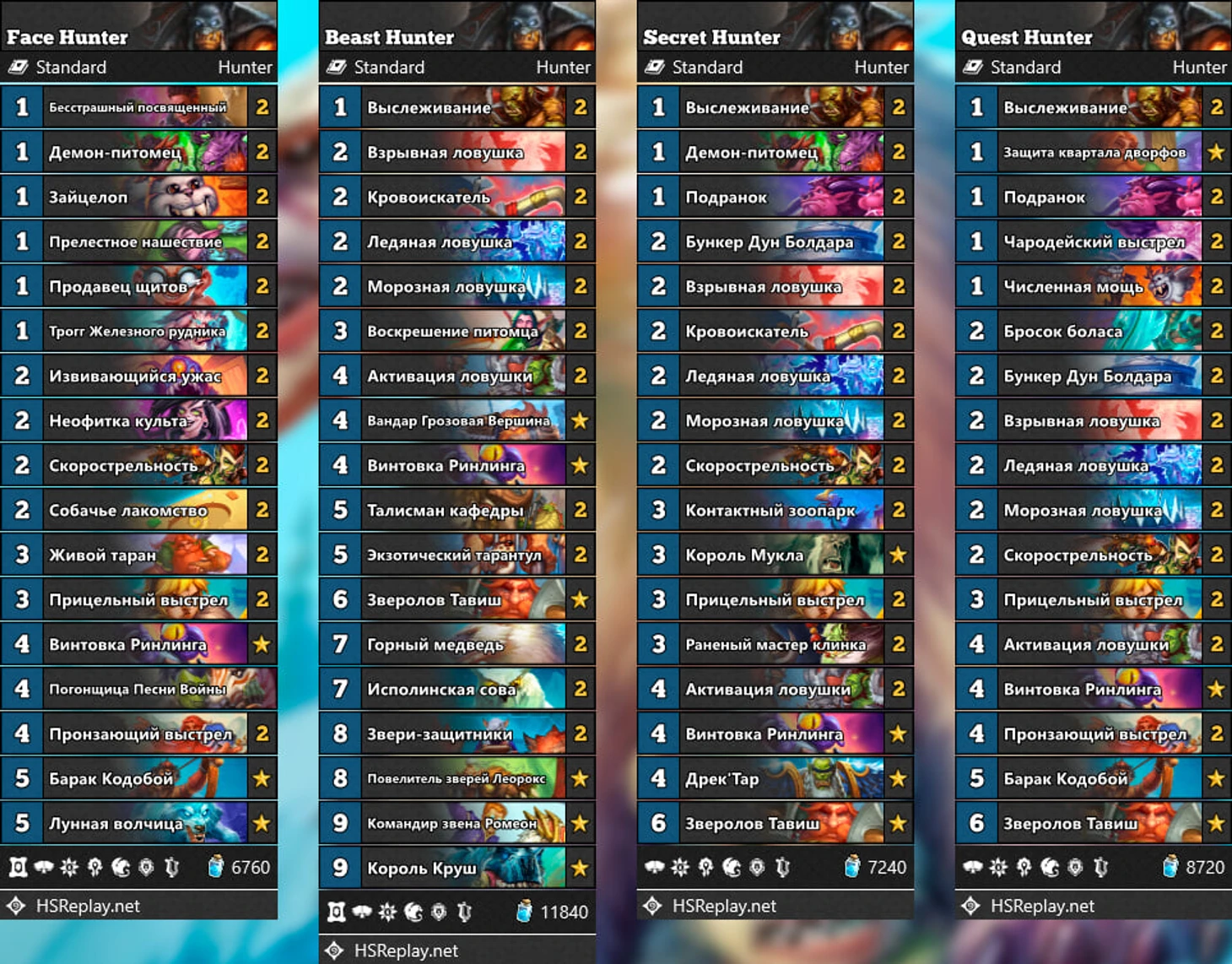 У Охотника появилась колода на больших зверях – хоть она и посредственная, зато веселая. В фейс-охотнике за столько лет ничего не поменялось, как и в версии с секретами. Квест-охотник тоже быстро разбивает лицо сопернику, но перед этим зачищает стол.