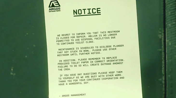 Не считая того, что ему нельзя пользоваться туалетом. Можно увидеть надпись о том, что туалет не работает, а под ней записку с пояснениями.