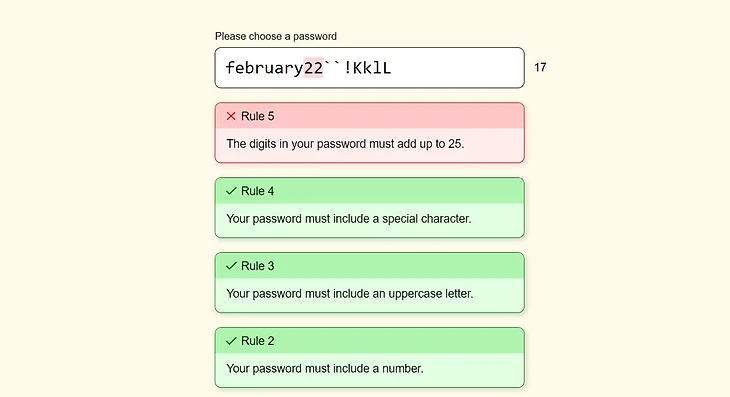 Интернет давно приучил нас, что в паролях должна быть одна заглавная буква, специальный символ, цифры и прочее. The Password Game – симулятор создания пароля с издевкой. Здесь требуют выделить жирным все гласные, добавить эмодзи, дату свадьбы, алгебраическое уравнение и все, что с такой же легкостью вылетает из головы, как новый пароль.