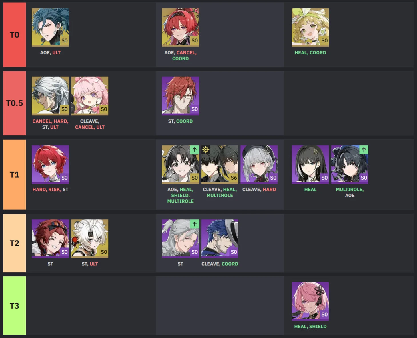T1 – Jianxin (AoE, Heal, Shield, Multirole), Rover Spectro (Cleave, Heal, Multirole), Sanhua (Cleave, Hard);