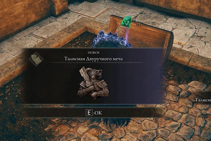 Для повышения шансов выпадения двуручника воспользуйтесь талисманом Серебряного скарабея или маринованной птичьей лапкой из основной игры. После убийства рыцаря пробегите немного вперед, поднимитесь на лифте и активируйте там благодать. Отдохните, чтобы мир обновился, и можно снова приступать к фарму. Вероятно, меч выпадет не с первого раза – как повезет.