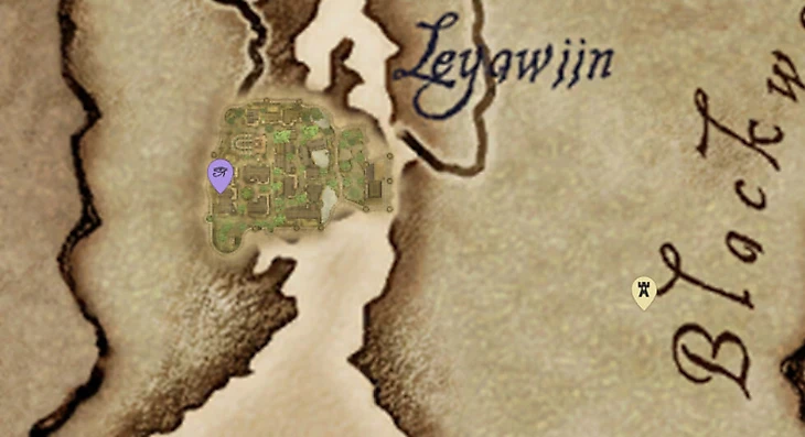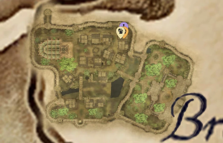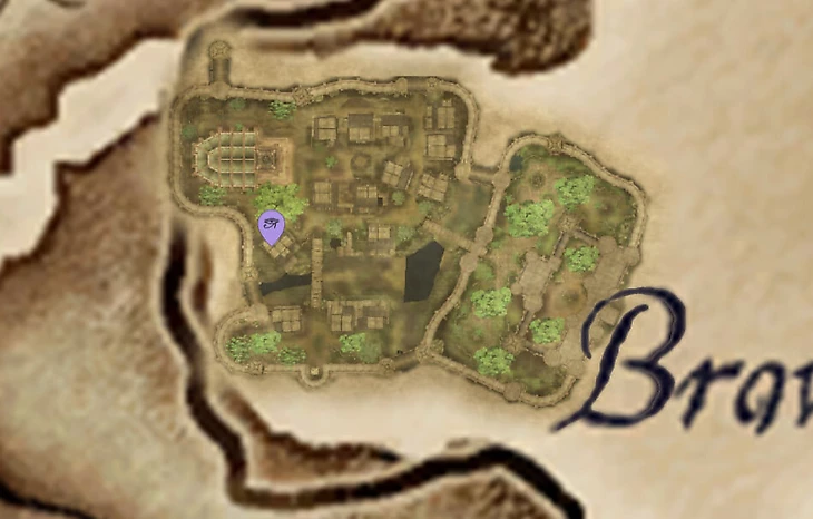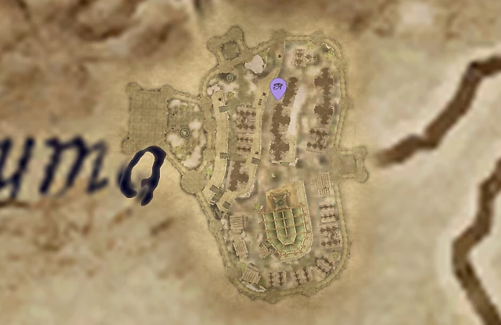 Если не получается и свитков под рукой нет, просто подкупите собеседника. Он расскажет, что украл посох и отдал его Сорису Арениму. Данмер живет в столице, в районе Талос Плаза, его дом отмечен на скриншоте ниже. Его расположение тоже надо повысить до 70, чтобы он согласился продать посох. Или можно украсть ключ из его письменного стола, пойти в подвал и взять посох оттуда.