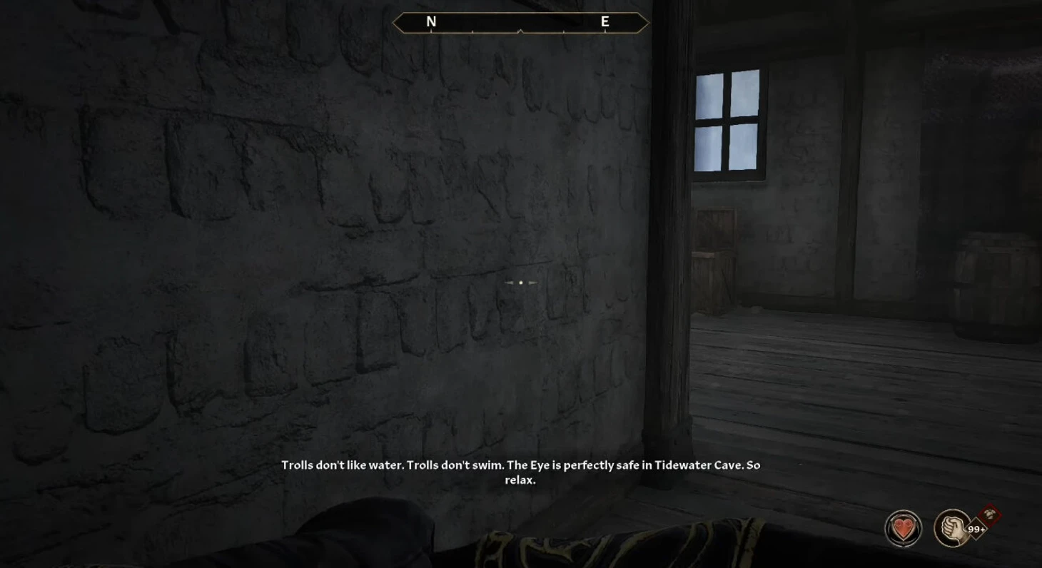 Они вам ничего не скажут, поэтому выходите из дома, садитесь в стелс и залезайте обратно. Так удастся подслушать, что они спрятали Глаз в пещере Приливная волна, и Беджин беспокоится, что его там съедят тролли.